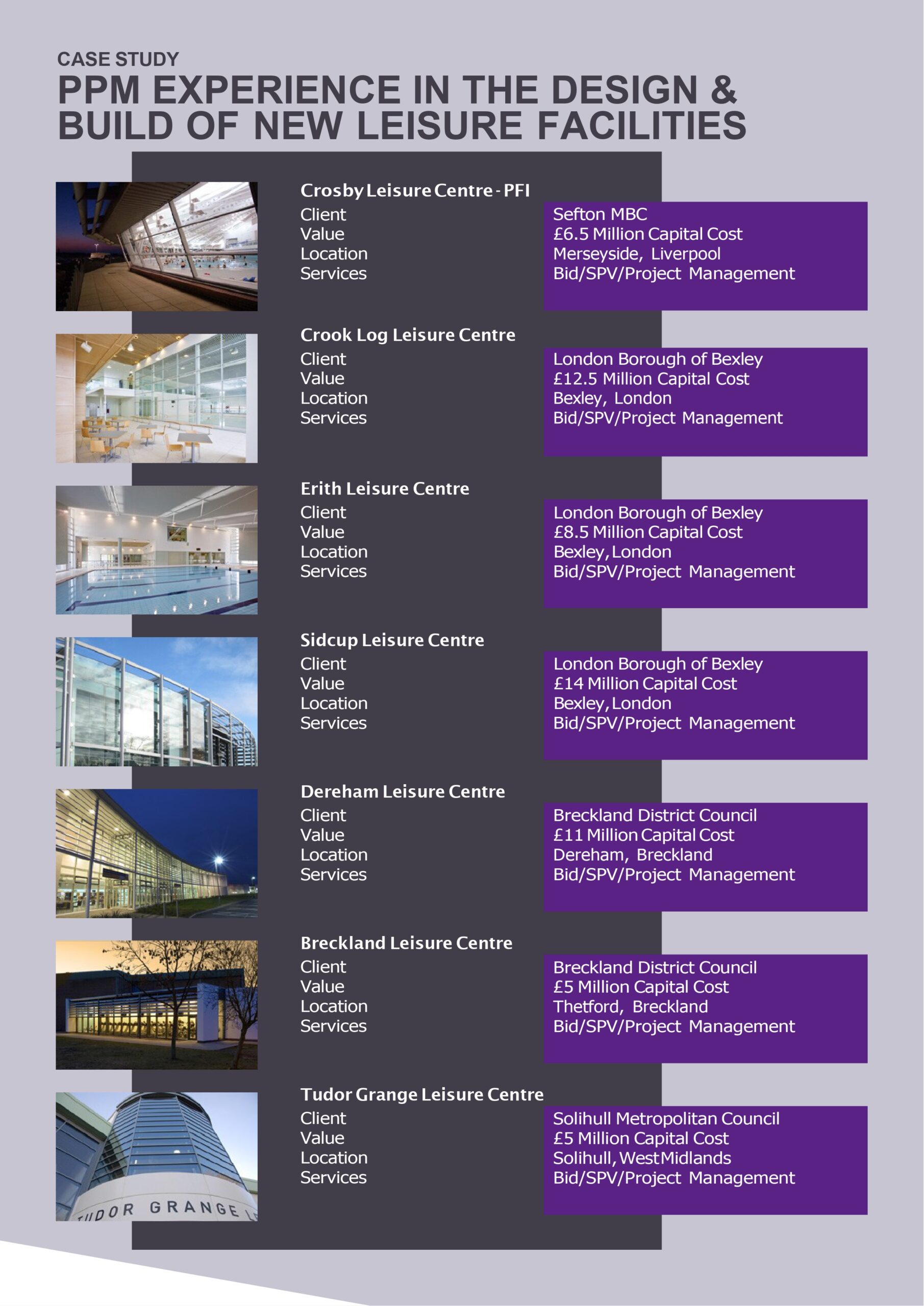 North Solihull Leisure Centre, with Solihull Metropolitan Council as the Client, a £2 Million Capital Cost, located in Solihull, West Midlands, and the services provided were Bid/SPV/Project Management.