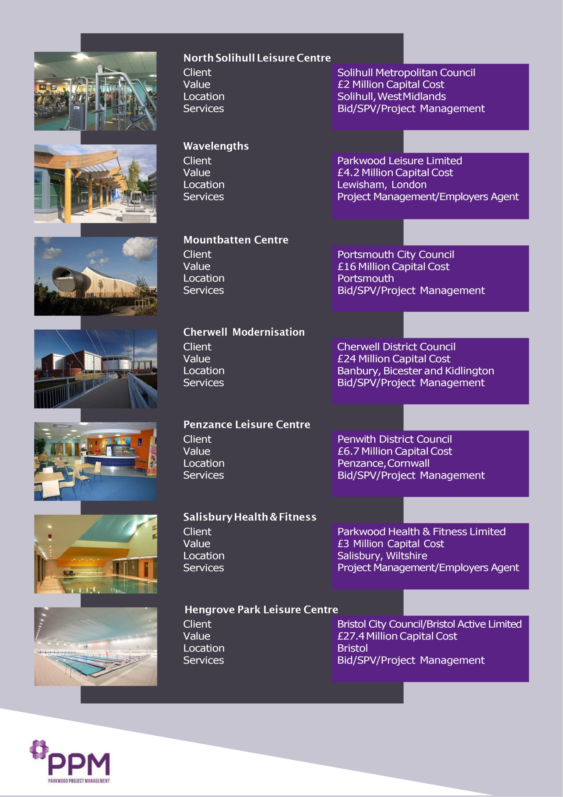 Hengrove Park Leisure Centre, with Bristol City Council/Bristol Active Limited as the Client, a £27.4 Million Capital Cost, located in Bristol, and the services provided were Bid/SPV/Project Management. The document also mentions Parkwood Project Management (PPM).